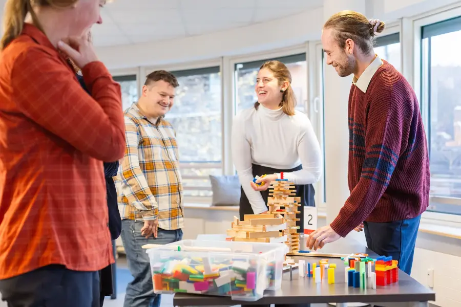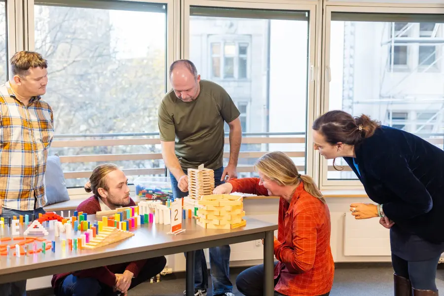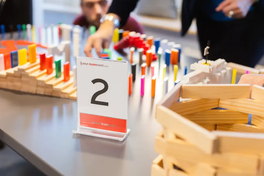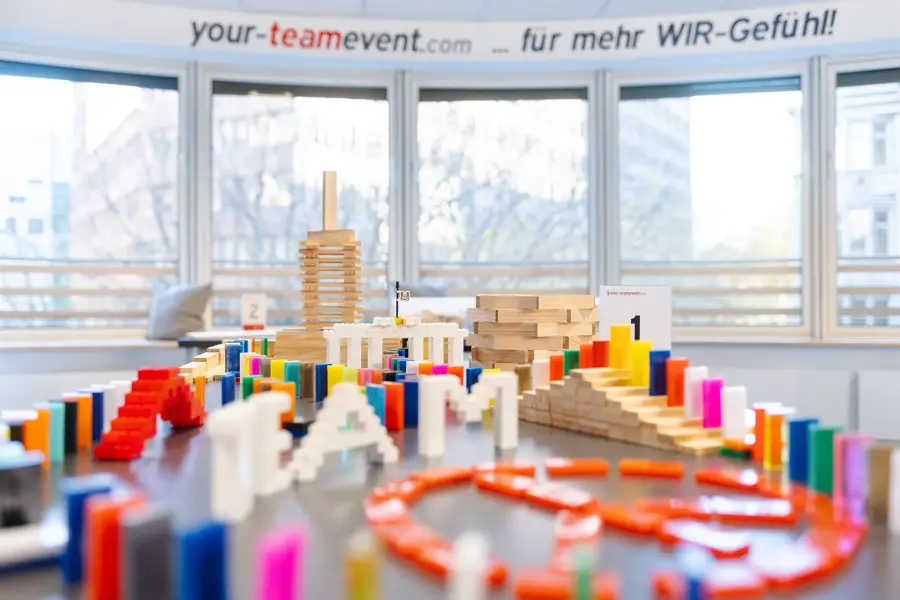 Angeleitet von unseren Moderatoren erschafft ihr in Kleinteams (5-6 Personen) bunte Reaktionen aus Domino-, Lego- und Kaplasteinen. Egal ob als Teambuilding mit gemeinsamem Showdown oder als Challenge innerhalb der Teams, hier kommt der Spieltrieb und Spaß nicht zu kurz. Dabei könnt ihr bekannte Berliner Bauwerke oder Euren Firmensitz nachbauen, das Logo darstellen oder den Unternehmenswerten in kreativer Art und Weise eine Form geben. Das Team Domino Effekt Event ist äußerst flexibel einsetzbar und bietet viele optionale Anpassungsmöglichkeiten an Eure Ziele und Wünsche. Bei diesem Teamevent entwirft jedes Team zu Beginn das eigene Bauwerk/Gebilde und setzt dieses dann auf dem eigenen Tisch um. Die Übergänge zwischen den Teamtischen werden ebenso mit den vorhandenen Baumaterialien gestaltet. Das Ergebnis sind tolle und einzigartige Domino-Welten, die von den Teams präsentiert werden und beim finalen Durchlauf der Domino-Kettenreaktion von allen Teams mit Begeisterung zelebriert werden.
